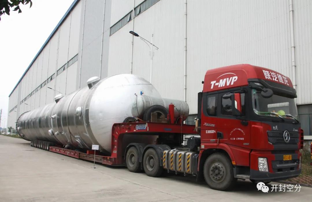 據(jù)悉,該項目下塔(含主冷凝蒸發(fā)器)重量約100噸,尺寸為31米×4.5米×4.7米,屬超大型設備運輸,由于發(fā)貨時間緊急,項目管理部及時組織運輸車輛,在空分設備廠及搬運隊的積極配合下圓滿完成了此次發(fā)貨任務。